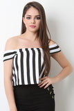 This bold crop top features an off-the-shoulder neckline, stripe print fabrication, concealed back zip closure, and crop hemline. Fully lined. Shell: 100% Polyester. Lining: 100% Polyester.