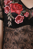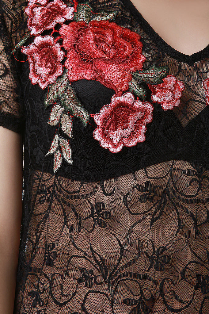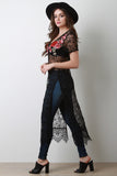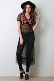 This maxi top features a semi-sheer lace fabrication, short sleeves, v-neckline, eyelash scallop hemline, side vent slits, and floral embroidered yoke. Accessory sold separately. Made in U.S.A. 90% Nylon, 10% Spandex.