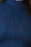This cute cr op top features a denim fabrication, slightly stretchy, sleeveless construction, ruffle trimming, mock neckline, and an exposed back zipper closure. Accessories sold separately. Made in U.S.A. 81% Cotton, 15% Polyester, 4% Spandex.