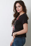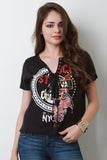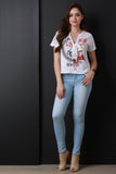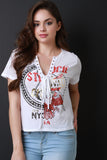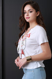 This top features a v-neckline, eyelets with a lace-up front, graphic print at front, short sleeves, and a boxy fit. Accessories sold separately. Made in U.S.A. 50% Cotton, 50% Modal.