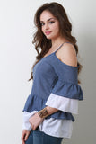 This cute top features a square neckline with spaghetti shoulder straps, cold shoulder design, multiple ruffled tiers, and three-quarter length bell sleeves. Accessories sold separately. Made in U.S.A. 50% Polyester, 50% Cotton.