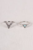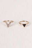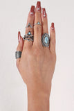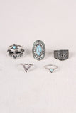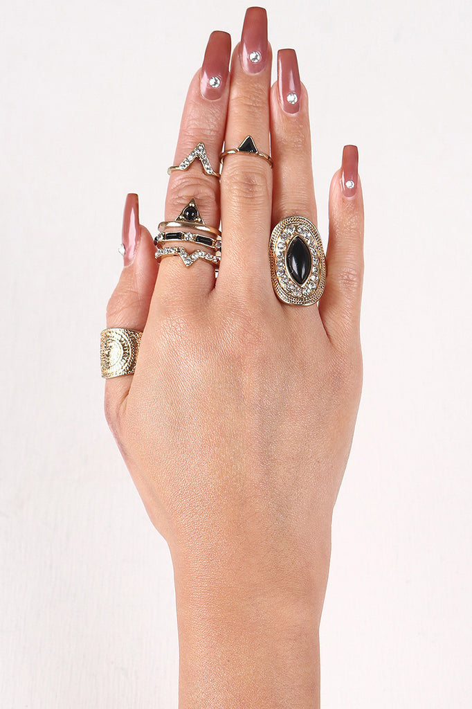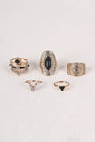 A set of five burnished rings featuring, faux stones, ornate faux gems, and etched designs.
