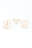 This ring set features three different styles, one double X pattern, one V pattern and the last one with a diamond pattern. Finished with a high-polished gold-tone frame and rhinestone detailing.