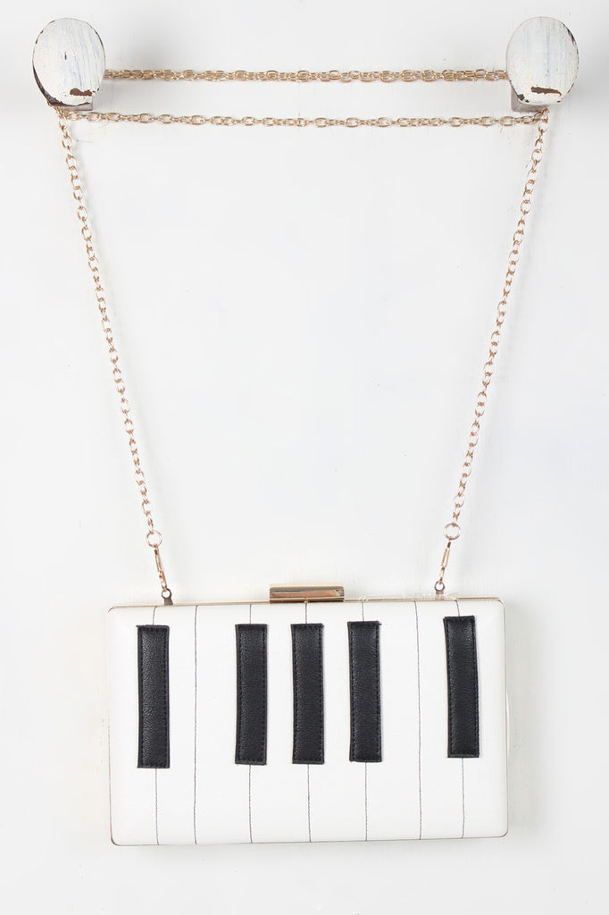 This clutch bag features piano keys design with metallic trim, lip design, and snap top closure. Interior features satin lining and finished with removable chain shoulder strap (26" drop).