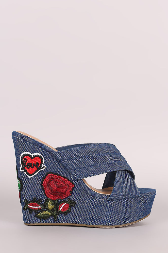 Bamboo Quilted Denim Cross Band Heart Patch Platform Wedge