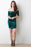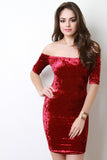 This chic dress features a crushed velvet knit fabrication, off the shoulder elastic neckline, half sleeves, curve hugging bodycon fit, and a rounded mini length hem. Accessories sold separately. Made in U.S.A. 96% Polyester, 4% Spandex.