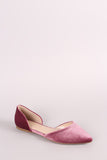 This dorsay flat features a soft velvet fabrication, pointy toe silhouette, open sides, lightly padded insole, and easy slip-on construction.