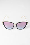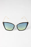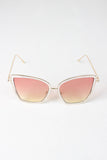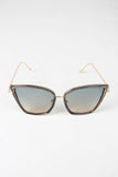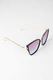 These trendy sunglasses feature a plastic frame with gold trimming, slight cat eye shaped lenses, and metallic wire arms that wrap slightly onto the front.