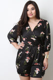This plus size romper features a floral print design, satin fabrication, surplice neckline, three-quarter length sleeves, and an elasticized cinched waist with removable self-tie belt. Finished with back cutouts with three button closures, shorts bottom half, and fully lined. Accessory sold separately. 100% Polyester.