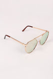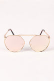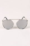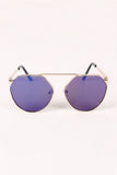 This charming sunglasses features a geometric-shape metallic frame with mirrored lenses, single bridge, metal arms, and clear nose cushions.
