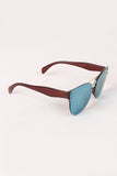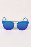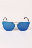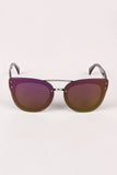 These sunglasses feature a butterfly wing silhouette, rimless design front with screw detail, double nose bridge, plastic arms, and nose cushions.