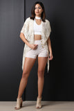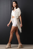 This cardigan features a loose diamond knit pattern, sort kimono sleeves, open front, and long fringed hemline. Accessory sold separately. 50% Cotton, 50% Viscose.