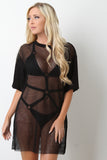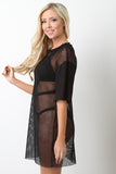 This shift dress features a crew neckline, semi-sheer netted material with contrast short sleeves, drop shoulders, and boxy cut fit. Accessories sold separately. Made in U.S.A. 100% Polyester.