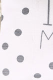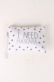 This adorable bag features a canvas look, polka dots throughout, "I need mascara" printed on both sides, rectangle pouch shape, top zipper closure, full lining, and wrist strap.